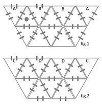 Assemblage de 24 triangles avec 72 clips. 1) Clipser 12 triangles (fig.1). 2) Installer la douille et l’ampoule. 3) Retourner l'assemblage (les clips sont à l'extérieur de la lampe) 4) Clipser A avec A et B avec B. 5) Clipser 12 triangles (fig.2). 6) Retourner l'assemblage (les clips sont à l'extérieur de la lampe) 7) Clipser C avec C et D avec D. 8) Clipser les deux cônes obtenus.